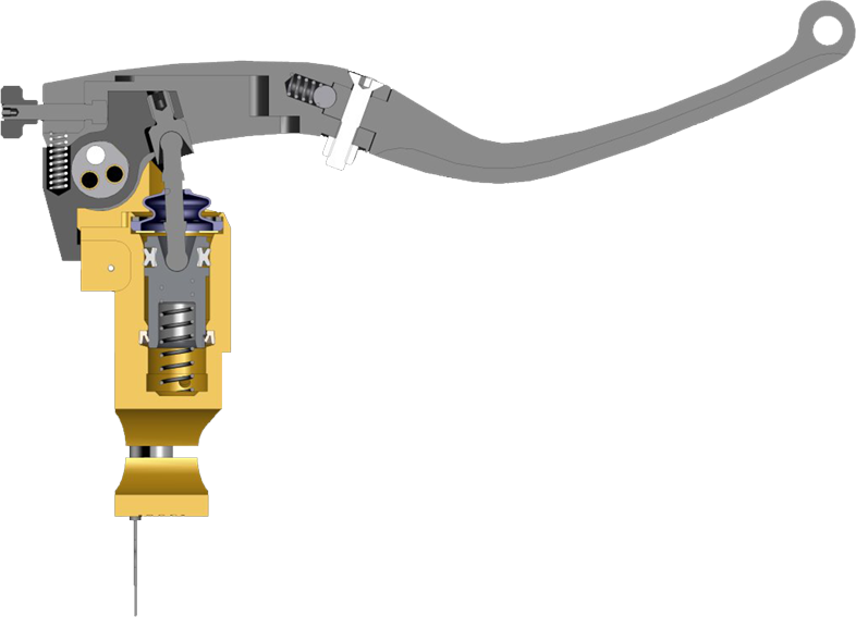 Druckstange und Zylinder befinden sich in einem 90°-Winkel zum Lenker, daraus resultieren geringe Übertragungsverluste und ein direkteres Bremsgefühl zur besseren Kontrolle.