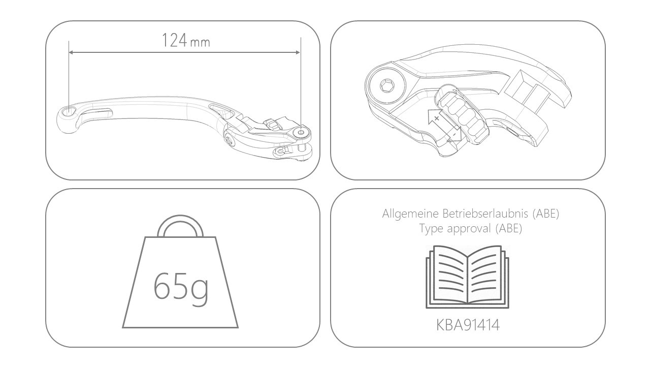 • 1x Bremshebel inkl. lasergravierter Genehmigungsnummer und Motorradspezifischen Hebeladapter