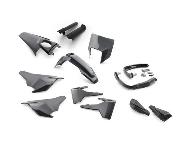 Gabelschutzkit, Kotflügel, Scheinwerfermaske, Spoilerset (rechts u. links), Heckspoiler rechts, Heckspoiler links, Kotflügel hinten, Handschützer und seitlichen Bügeln.