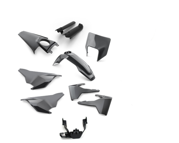 Gabelschutzkit, Kotflügel, Scheinwerfermaske, Spoilerset (rechts u. links), Heckspoiler rechts, Heckspoiler links, Kotflügel hinten, Handschützer und seitlichen Bügeln, Kotflügelanbindung vorn in schwarz.